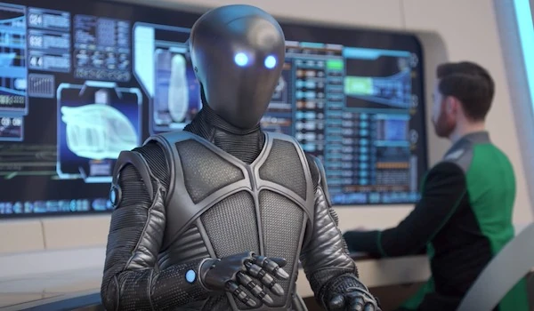 Isaac, likely the Chief Science Officer of the USS Orville, at his station on the Bridge.