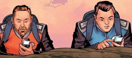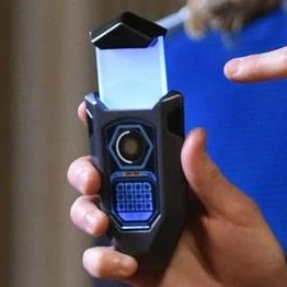 A Krill comscanner was called a go-spar.[1] It resembled two knife blades. Schematics are published in The World of the Orville and The Guide to The Orville. The communications array, into which the holder spoke, was at the base (or the "blades") of the device, where a light called the Active Indicator showed whether the device was actively listening. The activation button sat on the side. Most of the device consisted of the communications screen, which displayed information pertaining to calls. The bottom base of the go-spar could pop out to reveal a screen showing readings from scans. The final end consisted of the device's antenna array scan.
