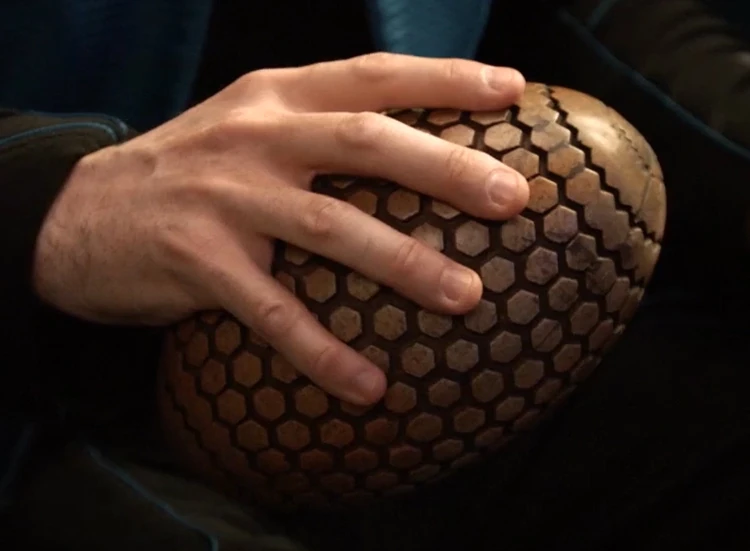 The latchkum was designed by property master Bryan Rodgers who simply drew an egg on a paper covered in alien symbols. Rodgers made two versions of the ball, one of hard rubber and the other solid wood. A blade from within the latchkum seemed to pop out when Seth MacFarlane (Ed Mercer) grabbed the latchkum, but in reality the blade was taped onto MacFarlane's hand.[5]