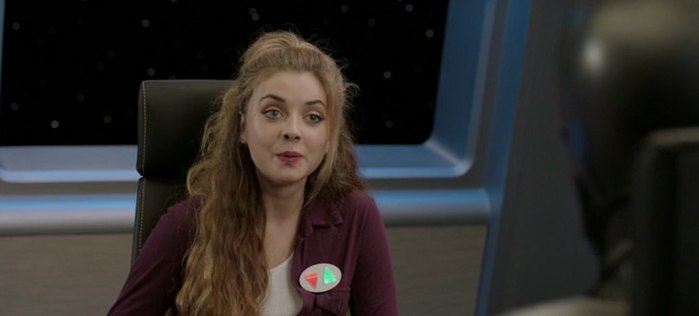 Bortus tells the bridge crew, "I sing," answered with uncertain silence. This is a harbinger for when Bortus nearly sings at karaoke in the episode Cupid's Dagger.