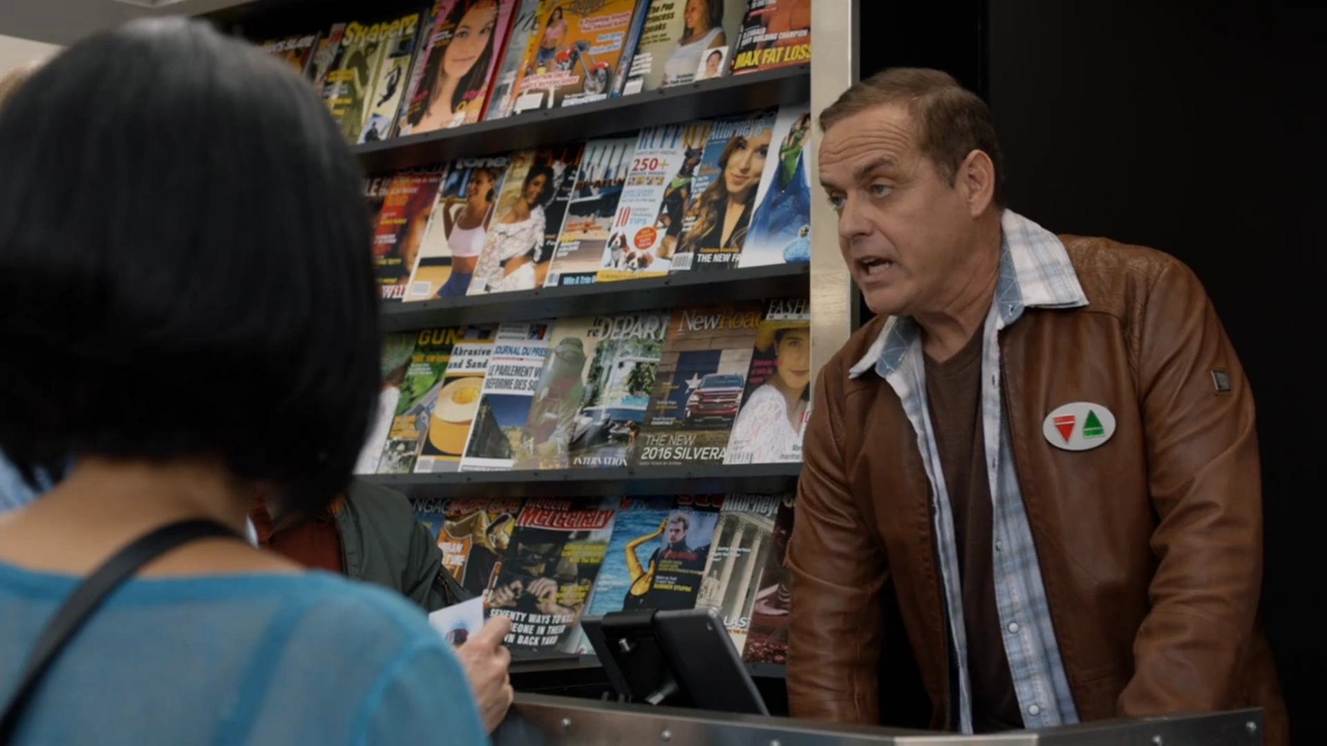 The magazines in the rack of the newspaper stall normally show generic topics that could apply to any civilization on any world, such as dieting trends and interior decoration. However, one anachronistic headline slipped through: "The New 2016 Silverado."