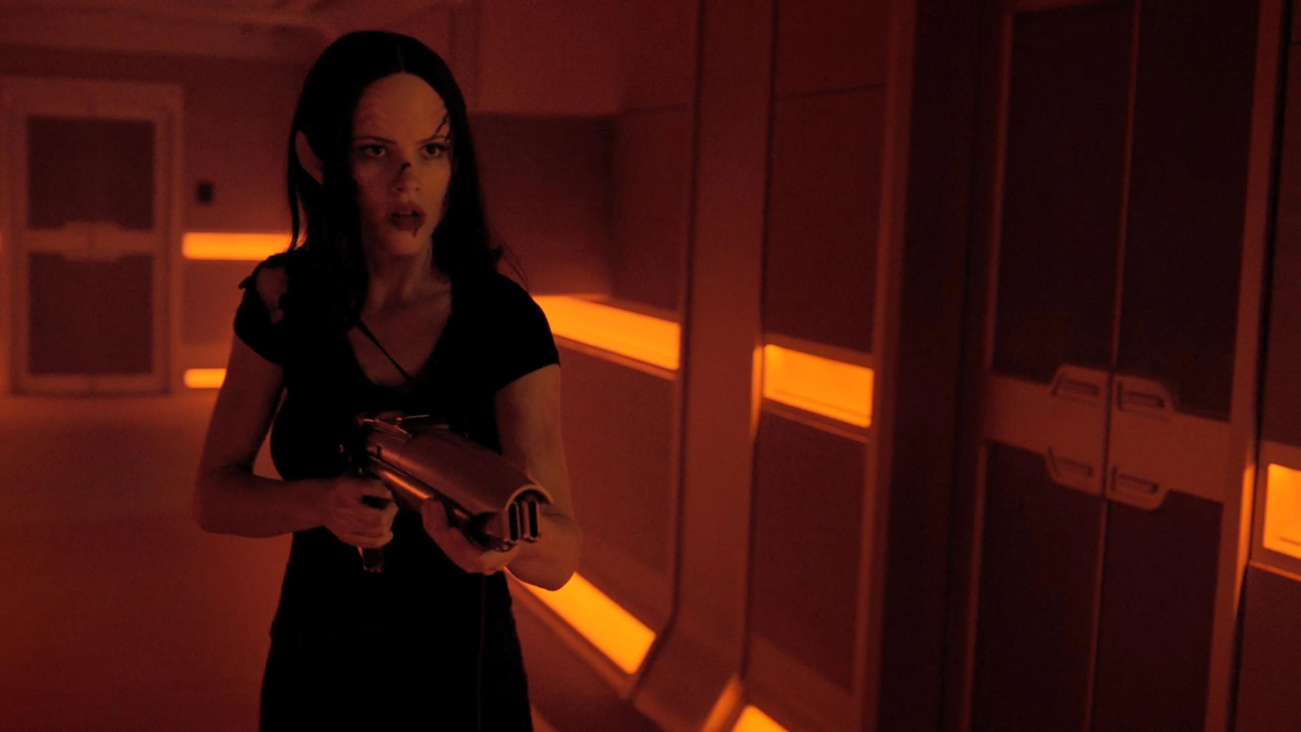Within a simulator, Chief of Secutity Alara Kitan wields a PM-488 Titan.