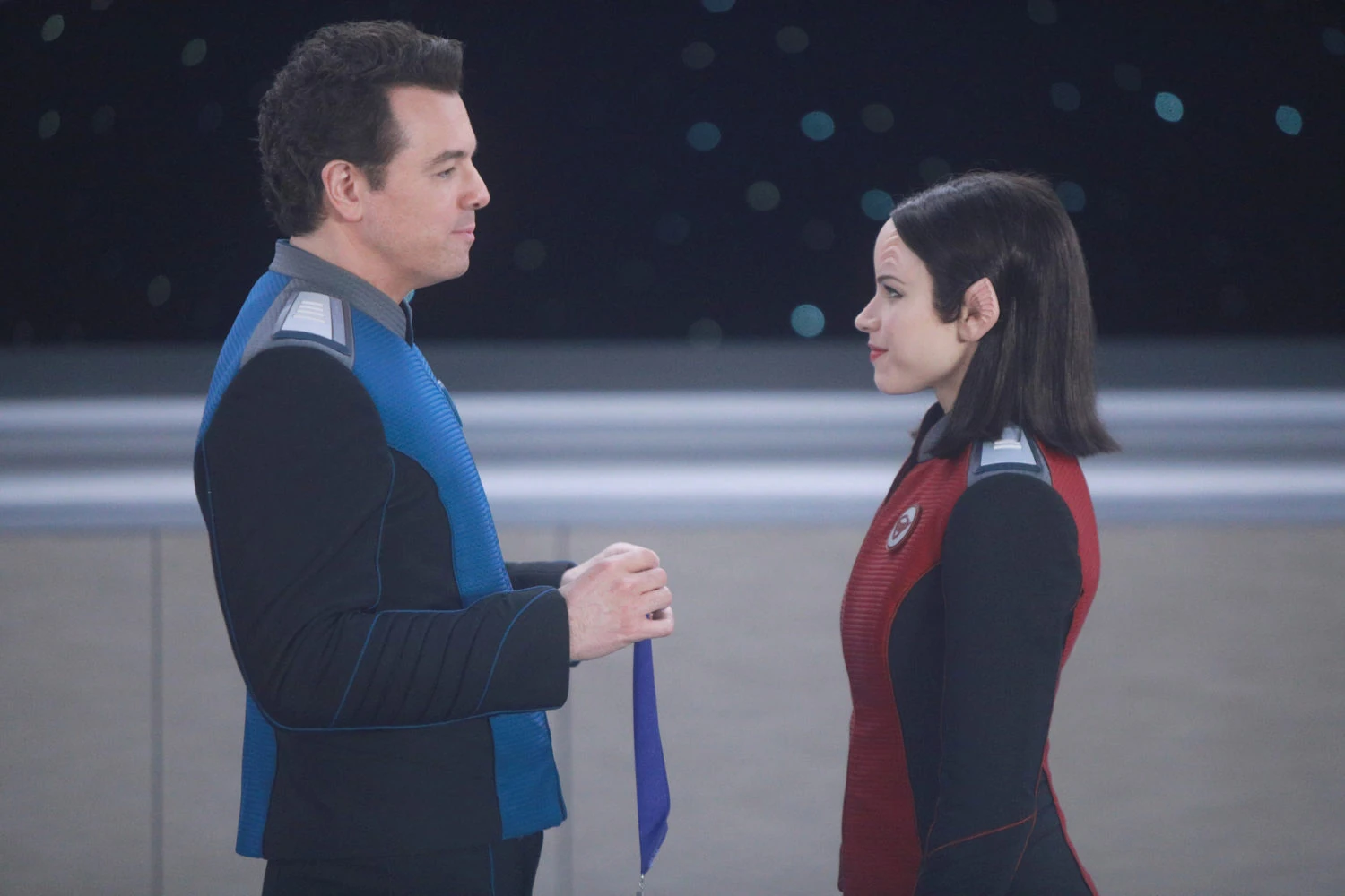 - ↑ Note that in this episode, Talla Keyali acknowledges that she still hasn't been on the Orville "that long."